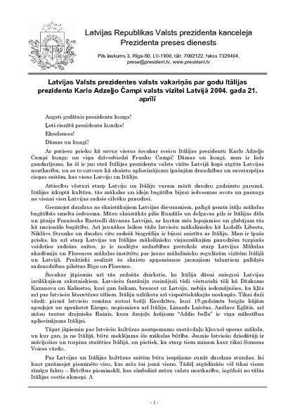 Latvijas Valsts prezidentes valsts vakariņās par godu Itālijas prezidenta Karlo Adzeļjo Čampi valsts vizītei Latvijā 2004. gada 21. aprīlī