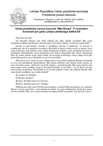 Valsts prezidentes uzruna koncertā “Mēs-Eiropā” 11.novembra krastmalā par godu Latvijas pilntiesīgai dalībai ES