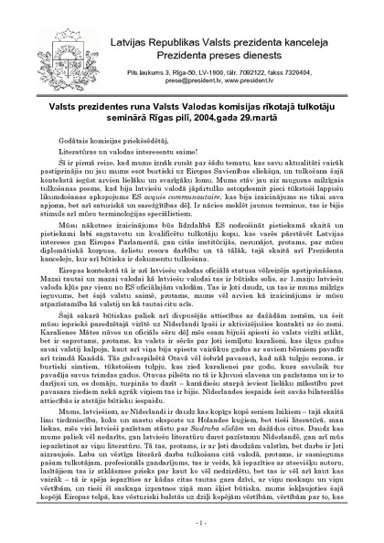 Valsts prezidentes runa Valsts Valodas komisijas rīkotajā tulkotāju seminārā Rīgas pilī, 2004.gada 29.martā