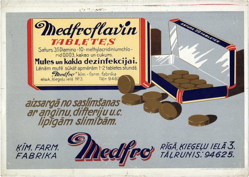 Medfroflavin tabletes aizsargā no saslimšanas ar angīnu, difteriju u.c. lipīgām slimībām [attēls] Medfro: ķīm.-farm. fabrika Rīgā