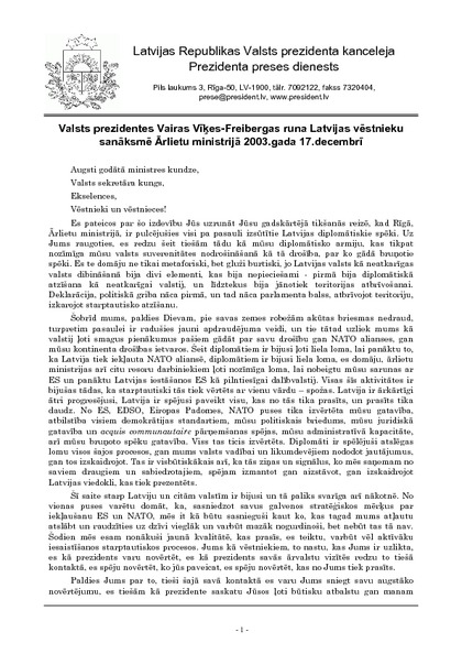 Valsts prezidentes Vairas Vīķes-Freibergas runa Latvijas vēstnieku sanāksmē Ārlietu ministrijā 2003.gada 17.decembrī