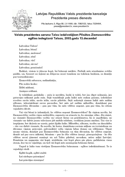 Valsts prezidentes uzruna Talsu iedzīvotājiem Pilsētas Ziemassvētku eglītes iedegšanā Talsos, 2003.gada 13.decembrī