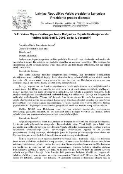 V.E. Vairas Vīķes-Freibergas tosts Bulgārijas Republikā dinejā valsts vizītes laikā Sofijā, 2003. gada 4. decembrī