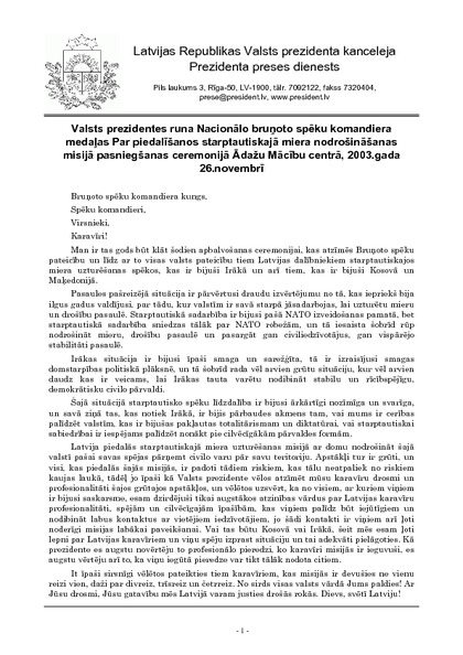 Valsts prezidentes runa Nacionālo bruņoto spēku komandiera medaļas Par piedalīšanos starptautiskajā miera nodrošināšanas misijā pasniegšanas ceremonijā Ādažu Mācību centrā, 2003.gada 26.novembrī