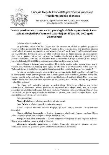 Valsts prezidentes uzruna kausu pasniegšanā Valsts prezidenta kausu izcīņas vieglatlētikā Valmierā uzvarētājiem Rīgas pilī, 2003.gada 25.novembrī
