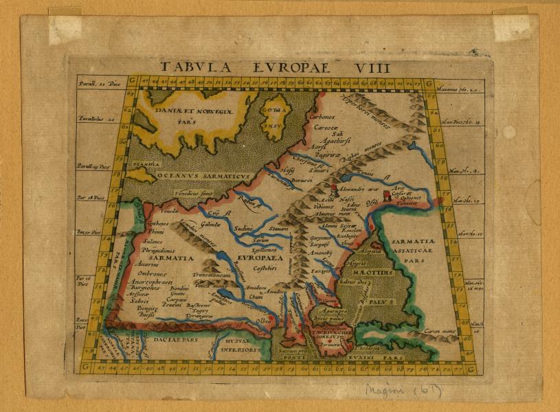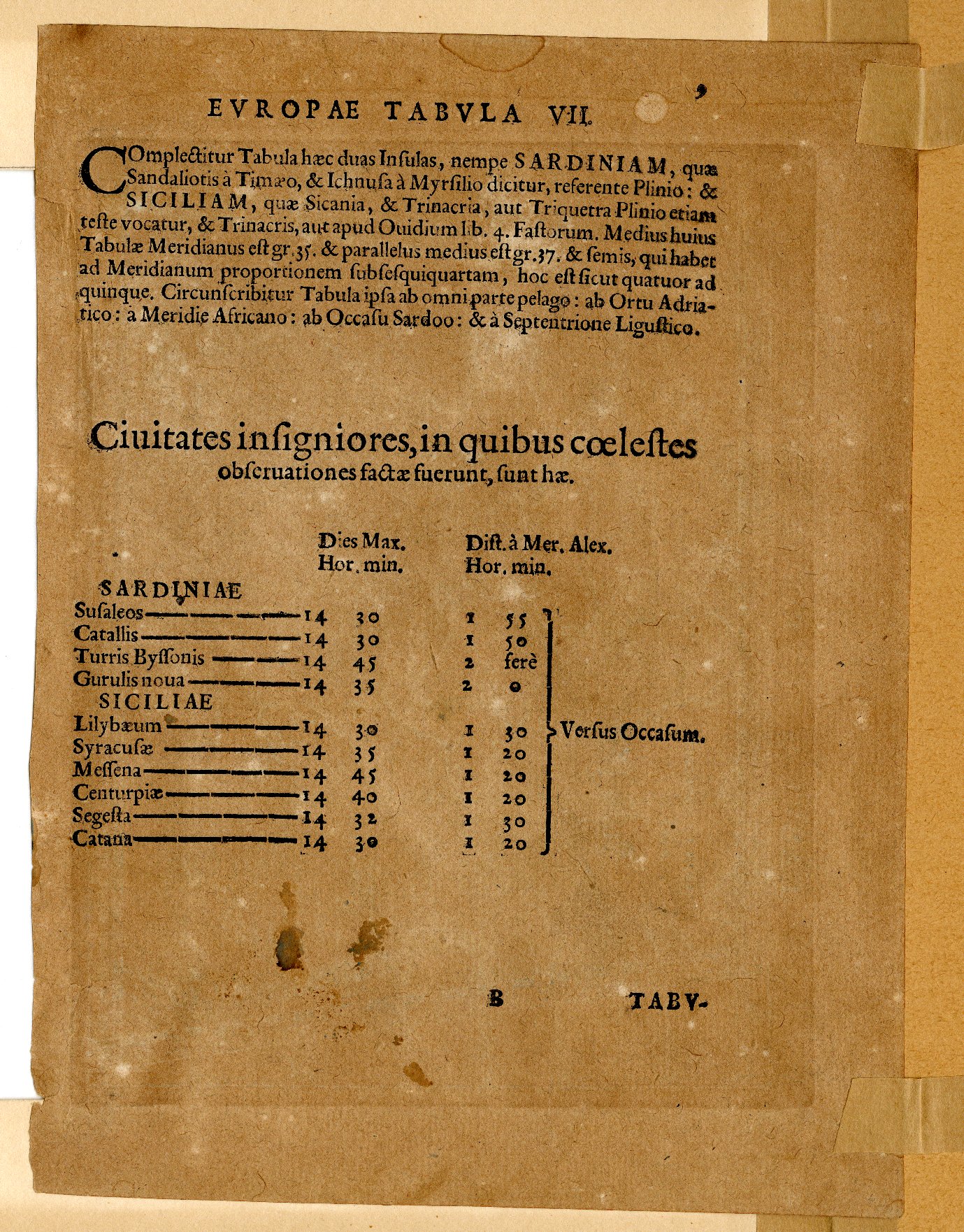 .Lapas otrā pusē virsraksts "Europae Tabvla VII", lpp. nr. "9" un teksts latīņu valodā, lapas apakšā "B" un "TABV-".