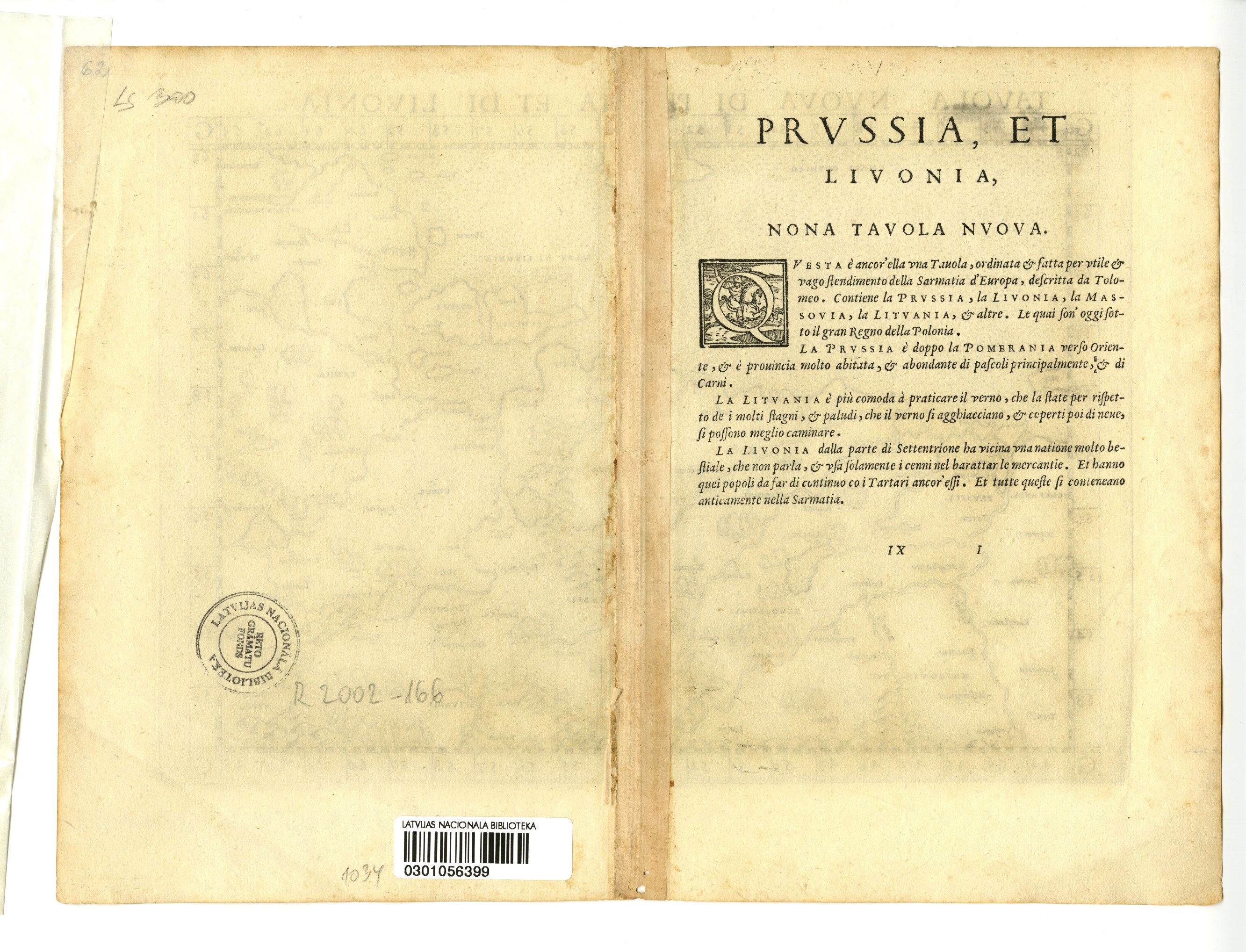 Lapas otrā pusē nosaukums "Prvssia, et Livonia, nona tavola nvova', teksts itāliešu valodā, Nr. "IX" un "I".