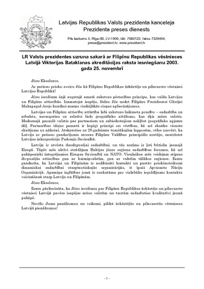 LR Valsts prezidentes uzruna sakarā ar Filipīnu Republikas vēstnieces Latvijā Viktorijas Bataklanas akreditācijas raksta iesniegšanu 2003. gada 25. novembrī