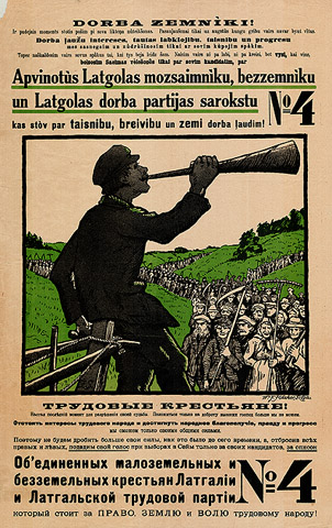 Трудовые крестъяне! Настал послъднiй моментдля разръшенiя своей судьбы... Поэтому не будем дробить больше свои силы, как это было до сего времени, а, отбросив всъх правых и лъвых, поддадим свой голос при выборах в Сейм только за своих кандидатов, за список Об'единенных малоземельных и безземельных крестъян Латгалiи и Латгальской трудовой партiи № 4
