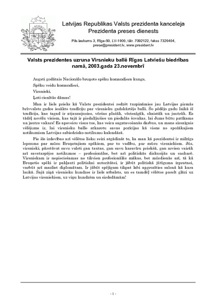 Valsts prezidentes uzruna Virsnieku ballē Rīgas Latviešu biedrības namā, 2003.gada 23.novembrī