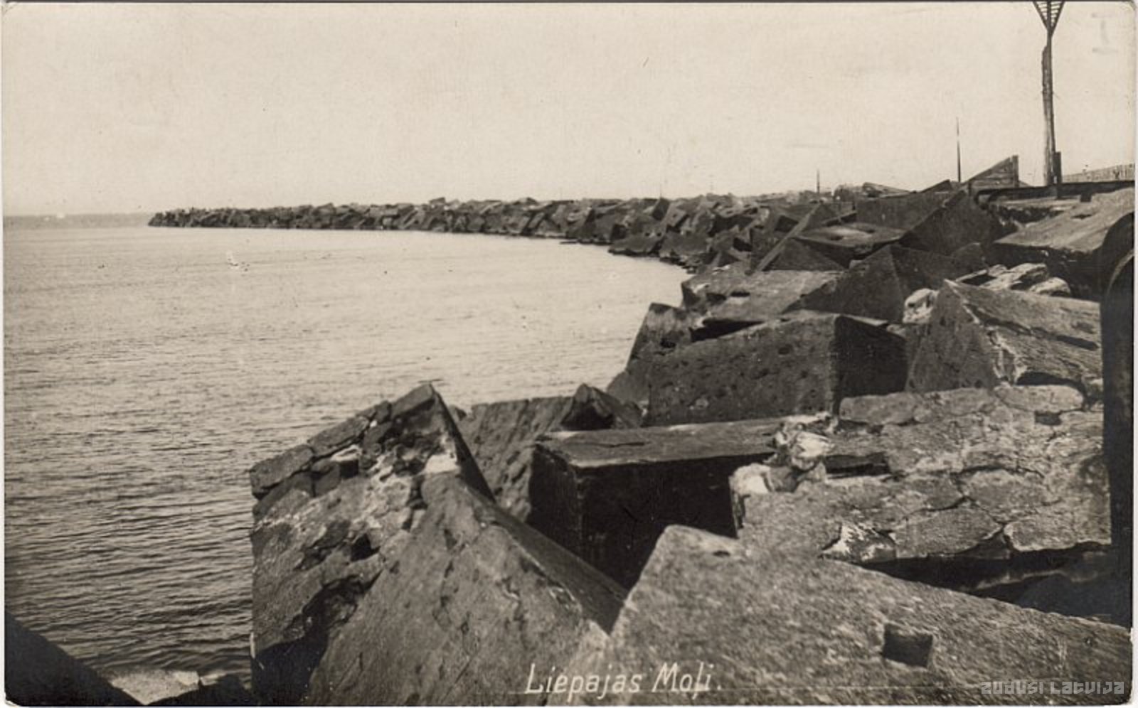 Viļņu lauzējs jeb mols Liepājas ostā (sākta būvēt 1697.gadā) ir jau kopš 1737.gada. 1860.gadā ostai ar ķeizara pavēli tika iecelta sevišķa ostas izbūves komisija inženiera pulkveža Gaidateļa vadībā un ostas izbūvei tika atvēlēti 1 700 000 rubļi - trīs gadu laikā osta bija ievērojami izbūvēta un padziļināta, tajā skaitā mola garums tika pagarināts par 30 asīm un sasniedza 123 pēdas, kā arī tika izbūvēti divi jauni akmeņu moli 400 asu garumā, uzcēla arī bāku. Ostas padziļināšanas darbi turpinājās līdz pat 1886.gadam. No 1890. līdz 1897.gadam Liepājas osta tiek izbūvēta par vienu no labākajām un lielākajām ostām, pie kuras ieejas (no jūras puses) ir 5 km garš mols - šāda arī ir osta laikā, kad tika uzņemta šī fotogrāfija. 19.gs. beigās un 20.gs. sākumā Liepājas osta ieņēma trešo vietu Baltijā tūliņ aiz Pēterburgas un Rīgas. Liepāja bija pirmā osta, kurai nācās ciest no I pasaules kara radītajiem apstākļiem - 1915.gadā pēc vairrākkārtīgas apšaudes to ieņēma vācu karaspēks. 1919.gadā, kad Rīgu ieņēma lielinieki (3.janvārī), uz Liepāju ar kuģi "Saratov" pārcēlās un 6 mēnešus uzturējās Latvijas pagaidu valdība ar K. Ulmani priekšgalā. Pēc I pasaules kara ostas apgrozīgums sasniedza tikai nelielu daļu no pirmskara apgrozījuma. Saistībā ar 1939.gada 5.oktobrī parakstīto Latvijas bāzu līgumu ar PSRS, Liepājā 1939.gada 23.oktobrī ienāca PSRS karaspēka daļas - Liepājas ostā iebrauca PSRS kara flotes eskadriļa, bet Latvijas kara flotes kuģi bija spiesti kara ostu pamest un doties uz citām Latvijas ostām. II pasaules kara laikā cieta arī Liepājas osta. Tā kā 1967.gadā osta kļuva par PSRS militāro objektu, tā bija noslēgta no ārpasaules un ietilpa aizliegtajā zonā. Darbu turpināja tikai zvejnieku osta, kuru apsaimniekoja zvejnieku kolhozs "Boļševiks" un Okeāna zvejas flotes bāze.