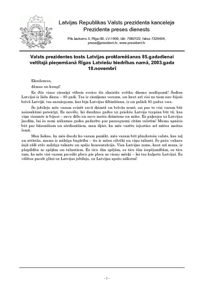 Valsts prezidentes tosts Latvijas proklamēšanas 85.gadadienai veltītajā pieņemšanā Rīgas Latviešu biedrības namā, 2003.gada 18.novembrī