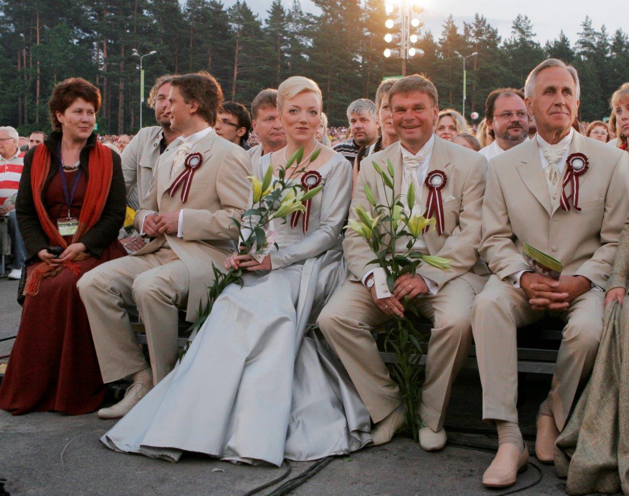 Virsdiriģenti Mežaparka estrādē, otrais no kreisās Ints Teterovskis, Aira Birziņa, Romāns Vanags un Jānis Erenštreits.
