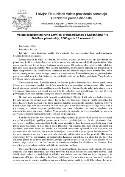 Valsts prezidentes runa Latvijas proklamēšanas 85.gadskārtā Pie Brīvības pieminekļa, 2003.gada 18.novembrī