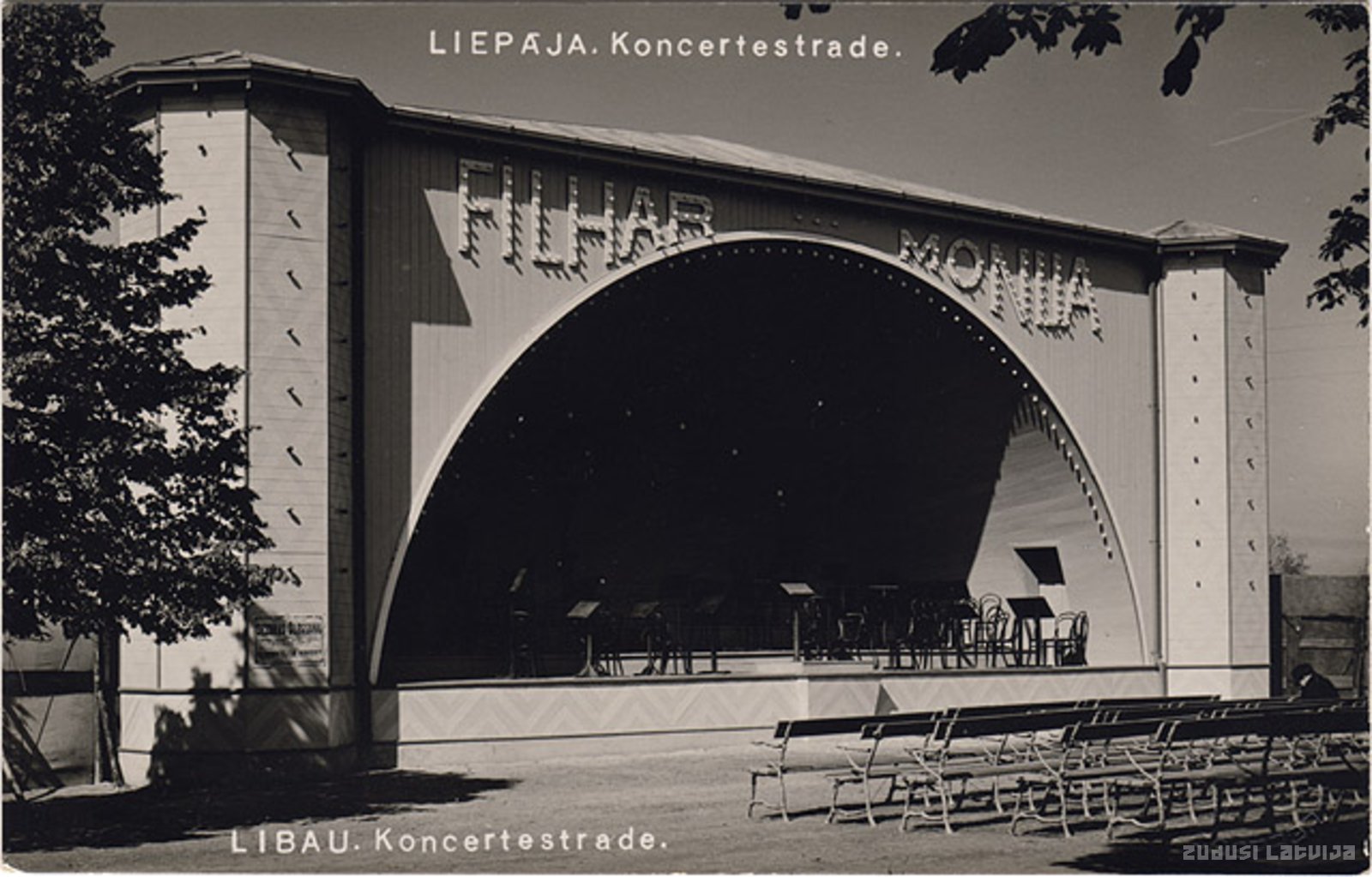 Estrāde ietilpa Liepājas Kūrmājas kompleksā, kura tika uzcelta 1875.gadā pēc P.M. Berči (Bertchy) projekta (Kūrmājas pamatakmeni ielika 1871.gadā, taču līdzekļu trūkuma dēļ tās būvi neuzsāka līdz pat 1874.gada rudenim, kad Liepāja saņēma Krievijas valdības aizdevumu 20000 rubļu apmērā Tās būve ilga 9 mēnešus un 1875.gada maijā to varēja uzskatīt par pabeigtu). Līdz ar to Liepājas sabiedriskā dzīve pārcēlās no Pilsētas parka jeb Alkšņu birzs uz Jūrmalas parku. Kūrmāju 1893.gadā apmeklēja pats cars Aleksandrs III ar carieni. Kompleksā ietilpa Kūrmāja ar restorānu, deju zāli, teātra izrāžu un koncertzāli ar 500 skatītāju vietām. Tā kā 1928. gadā vecā estrāde bija kļuvusi par mazu esošajām vajadzībām, vecās estrādes vietā uzcēla attēlā redzamo estrādi. Jau 1928.gada 5.augustā tur pulcējās 1.Lejaskurzemes dziesmu svētku dalībnieki (būvniecība notikusi arī naktīs). Kūrmāja un tās apkārtne laika gaitā tā kļuva par daudzo pilsētas kūrviesu, kā arī pašu pilsētnieku kultūras baudītšanas un atpūtas vietu. 20.gs. 30.gadu nogalē Kūrmājas nozīme liepājnieku atpūtā stipri mazinājās - pilsētnieki deva priekšroku liepājas pilsētas teātrim un operai, vēlāk - modernajam Latviešu biedrības namam. Kūrmāja savu pastāvēšanu pilnīgi izbeidza 1937.gada Lieldienās, kad to, pa daļai pamestu un nevajadzīgu, nodedzināja iespējams vietējie klaidoņi, taču tas nav pierādīts. Tā kā pilsētas valdei šī Kūrmājas ēka likās jau savu laiku nokalpojusi, tā jau bija paredzēta nojaukšanai, lai celtu jaunu kūrmāju tuvāk jūrai.