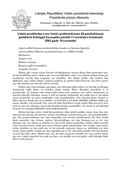 Valsts prezidentes runa Valsts proklamēšanas 85.pastāvēšanas gadskārtā Svinīgajā karaspēka parādē 11.novembra krastmalā 2003.gada 18.novembrī