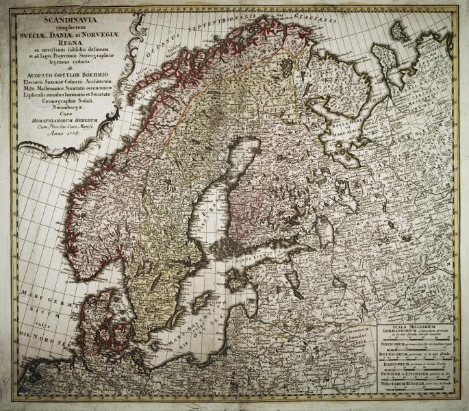 Scandinavia complectens Sveciae, Daniae et Norvegiae Regna ex novissimis subsidiis delineata et ad Leges Projectionis Stereographicae legitimae reducta ab Augusto Gottlob Böehmio...