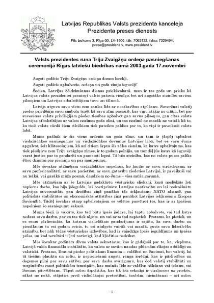 Valsts prezidentes runa Triju Zvaigžņu ordeņa pasniegšanas ceremonijā Rīgas latviešu biedrības namā 2003.gada 17.novembrī
