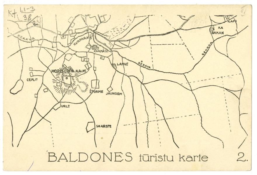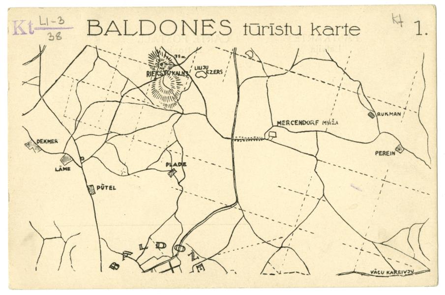 Baldones apkārtnes shematiskajā kartē uzrādītas mājas, parki, kapi, ceļi, kalni, upes, ezeri