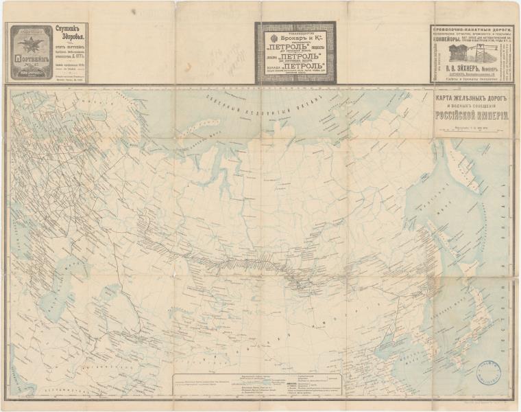 Cariskās Krievijas Eiropas daļas kartē uzrādīti satiksmes ceļi uz 1908/09.g. ziemu.