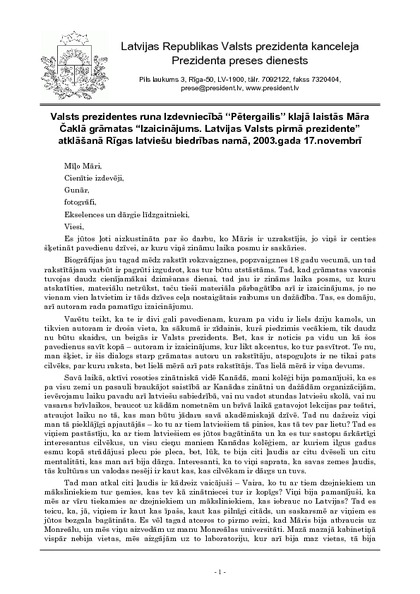 Valsts prezidentes runa Izdevniecībā “Pētergailis” klajā laistās Māra Čaklā grāmatas “Izaicinājums. Latvijas Valsts pirmā prezidente” atklāšanā Rīgas latviešu biedrības namā, 2003.gada 17.novembrī