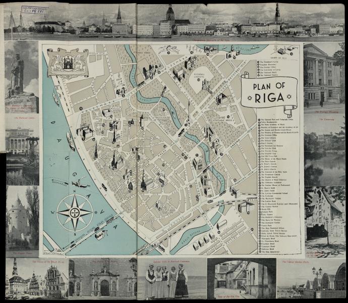 Kartes labajā malā ievērojamāko objektu rādītājs, karti ietver fotogrāfijas; lapas otrā pusē informācija par Rīgu un vienas dienas ekskursijas apraksts