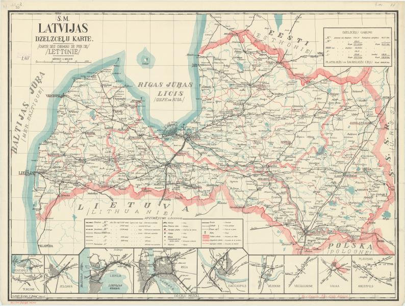Latvijas dzelzceļu kartē uzrādīti dzelzceļi atbilstoši sliežu platumam, stacijas, dažādu kategoriju ceļi, robežas, pilsētas, miesti, baznīcas un bākas