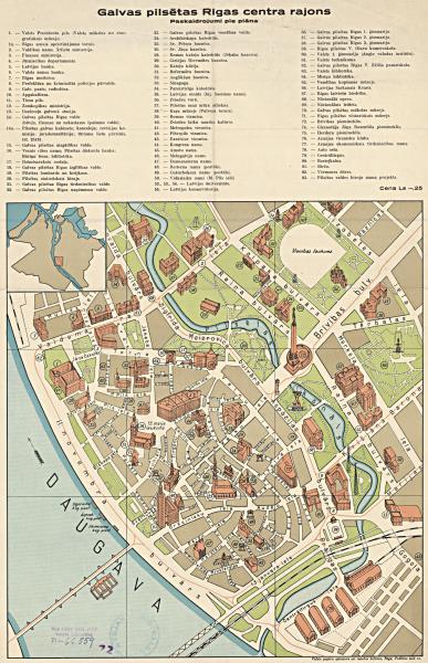 Vecrīgas plānā ilustratīvi uzrādītas ievērojamākās ēkas, ielu dzelzceļš, parki, laukumi, pieminekļi