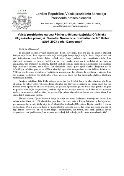 Valsts prezidentes uzruna Pēc iestudējuma dzejnieka O.Vācieša 70.gaskārtas piemiņai “Vācietis. Novembris. Klavierkoncerts” Dailes teātrī, 2003.gada 13.novembrī
