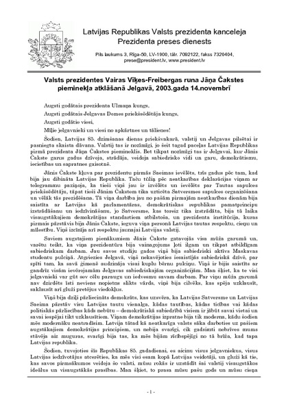 Valsts prezidentes Vairas Vīķes-Freibergas runa Jāņa Čakstes pieminekļa atklāšanā Jelgavā, 2003.gada 14.novembrī