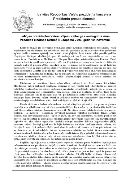 Latvijas prezidentes Vairas Vīķes-Freibergas noslēguma runa Pasaules zinātnes forumā Budapeštā 2003. gada 10. novembrī