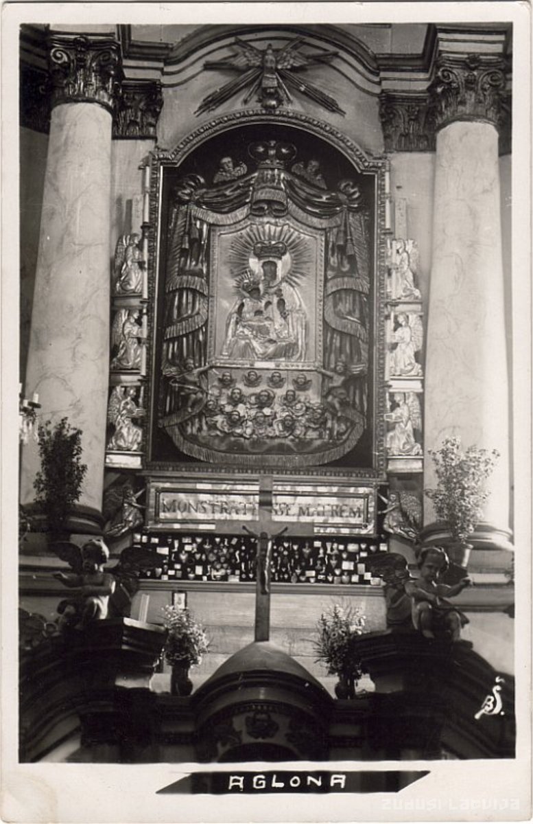 1768.-1780.gadā celtās mūra Aglonas baznīcas (bazilika kopš 1980.gada) altārglezna ir Dievmātes attēls, kas ir Trāķu Romas katoļu baznīcas Dievmātes un Lietuvas valsts aizgādnes kopija (pēc citas versijas - šī glezna ir oriģināls).