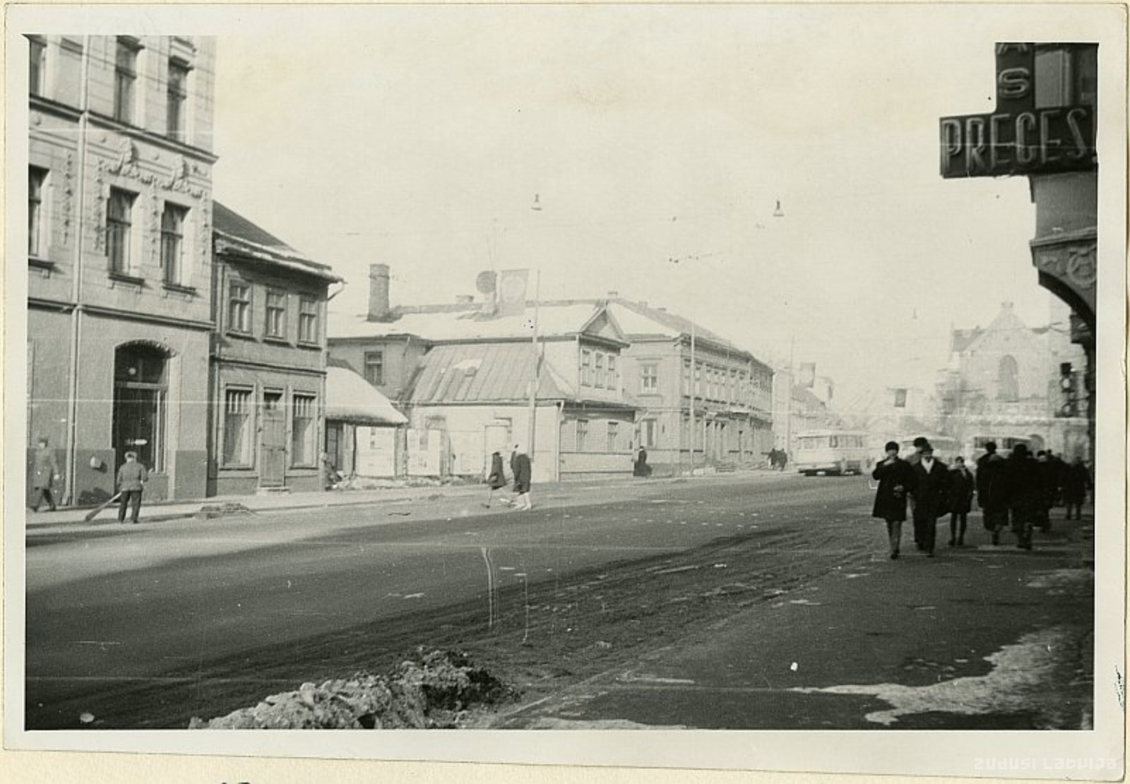 Centrā redzamā koka apbūve Brīvības ielā nr. 107 (paralēls nr. Palīdzības ielā 18) nojaukta 70. [?] gados. 20. gados tur darbojās Paula Lapiņa pirts (paša gruntsgabalā), 20. gados un 30. gadu sākumā - Kārļa Baumaņa restorāns. 20. un 30. gadu mijā tur atradās Zelmas Amtmanes fotodarbnīca, 30. gadu 2. pusē - E. Jirgensona fotostudija. Aiz krustojuma ar Palīdzības ielu koka nams Brīvības ielā nr. 109 - bijušais rūpnieka V. Anspaha īpašums. Līdz 30. gadu vidum šajā gruntsgabalā darbojās V. Anspaha austuve un krāsotava (ierīkota 20. gs. sākumā). Pēckara gados tur izvietojās kombināts “Somdaris”. Ēkā 20. gadu beigās un 30. gados darbojās “Aleksandra aptieka” (īpašnieks A. Cinniuss, vēlāk H. Sangs /Zangs/). [avots: R. Zalcmanis "Nezināmā Rīga"]