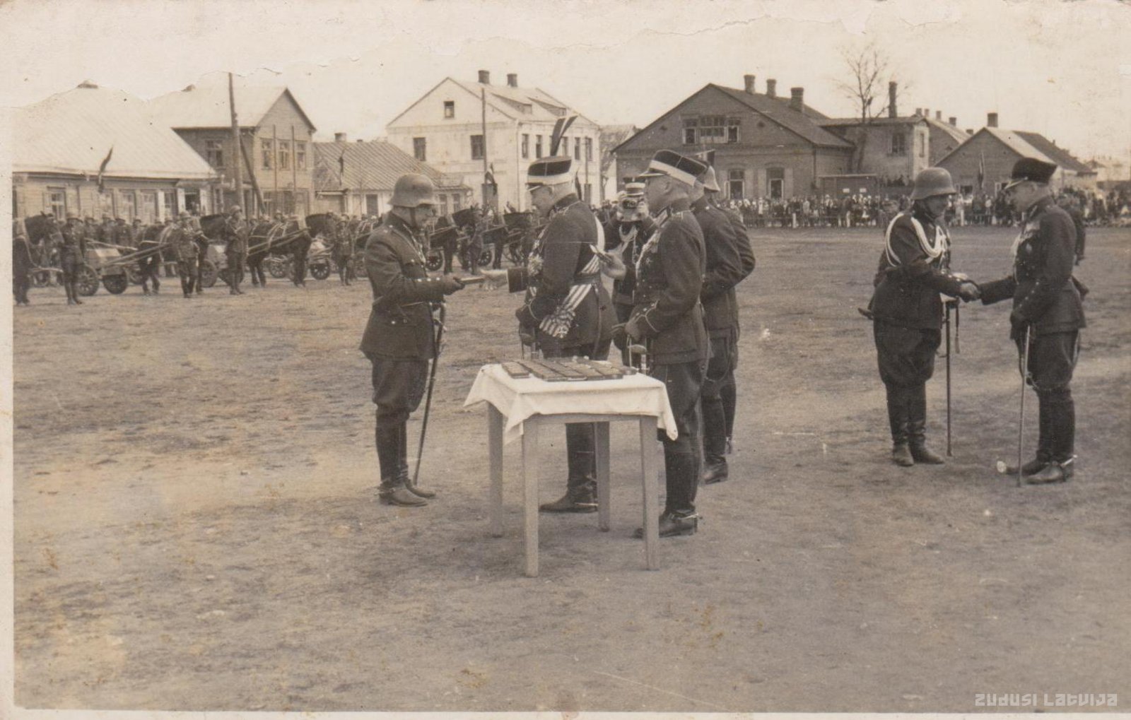 12. Bauskas kājnieku pulka 20 gadu svētki Daugavpilī. Kara ministrs ģenerālis Krišjānis Berķis apbalvo pulka karavīrus, asistents adjutants pulkvedis leitnants Roberts Osis