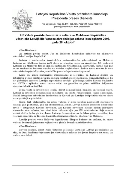 LR Valsts prezidentes uzruna sakarā ar Moldovas Republikas vēstnieka Latvijā Ilie Vancea akreditācijas raksta iesniegšanu 2003. gada 28. oktobrī