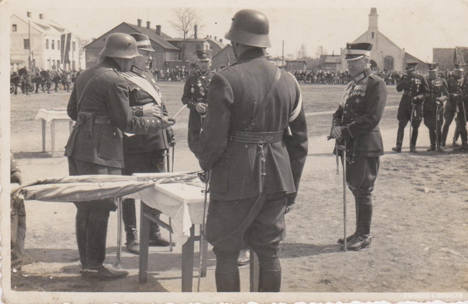 12. Bauskas kājnieku pulka 20 gadu svētki Daugavpilī. Kara ministrs ģenerālis Krišjānis Berķis iesit piemiņas naglu pulka karogā, adjutants pulkvedis leitnants Roberts Osis, bijušais pulka komandieris (1920-1929) ģenerālis Jānis Ezeriņš