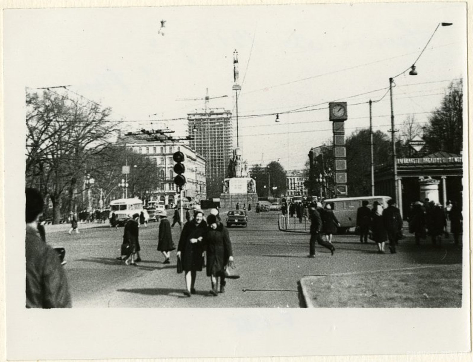 Tālākajā plānā redzama viesnīcas "Latvija" augstceltnes celtniecība