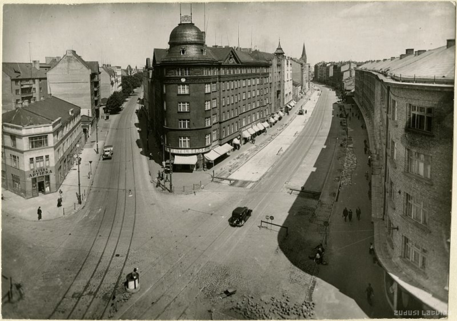 Centrā mūra īres nams ar veikaliem, kas celts 1913.-1914.g., arhitekts G. fon Tīzenhauzens; nams izdega ugunsgrēkā Otrā pasaules kara laikā, drupas vēlāk nojauktas. Nama agrākais nr. Brīvības ielā 67/69; bijušais Viškina nams, 30. gados izdevējas Emīlijas Benjamiņas īpašums. 30. gados tur dzīvoja žurnālists, laikraksta ”Jaunākās Ziņas” ārzemju nodaļas redaktors, izdevēja Antona Benjamiņa dēls Jānis Benjamiņš, krievu laikraksta “Sevodņa” izdevējs Jakovs Brāms, 30. gadu beigās - Rīgas pilsētas Diskonta bankas direktors, bijušais Bauskas apriņķa priekšnieks Kārlis Berķis. 40. gadu sākumā šajā namā, Miera ielas pusē, dzīvoja bijušais Valsts prezidents (1930-1936), zv. advokāts Alberts Kviesis. 20. un 30. gados namā darbojās M.Milleres privātā pamatskola un ģimnāzija, Latvijas Radioklubs, krājaizdevu sabiedrība un palīdzības biedrība “Paritaet”. 1923.-1926.g. namā darbojās Rīgas Arodbiedrību centrālbirojs. Namā atradās vairāki veikali, t. sk. a/s “Moritz Feitelberg” modes preču veikals, H. Prīma, vēl. N. Prīma optikas veikals, šokolādes fabrikas “Maķedonija”, vēlāk V. Ķuzes konditorejas fabrikas ražojumu veikals.