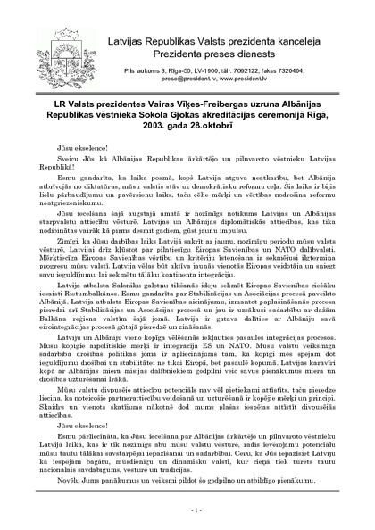LR Valsts prezidentes Vairas Vīķes-Freibergas uzruna Albānijas Republikas vēstnieka Sokola Gjokas akreditācijas ceremonijā Rīgā, 2003. gada 28.oktobrī