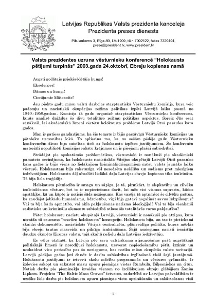 Valsts prezidentes uzruna vēsturnieku konferencē “Holokausta pētījumi turpinās” 2003.gada 24.oktobrī, Ebreju kopienas namā