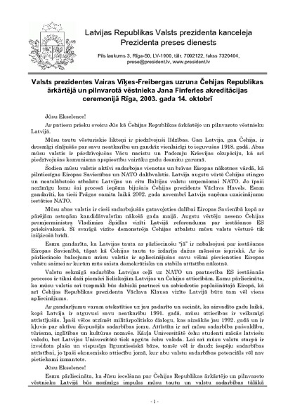 Valsts prezidentes Vairas Vīķes-Freibergas uzruna Čehijas Republikas ārkārtējā un pilnvarotā vēstnieka Jana Finferles akreditācijas ceremonijā Rīga, 2003. gada 14. oktobrī