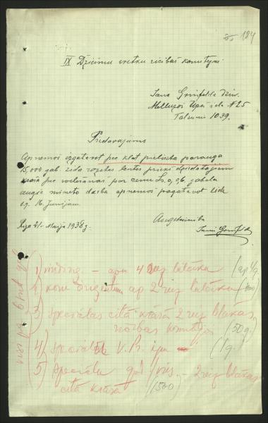 Dažādi dokumenti un sarakste. Par Dziesmu svētku piemiņas žetonu izgatavošanu - Nav autora - 1938 (Dokuments)