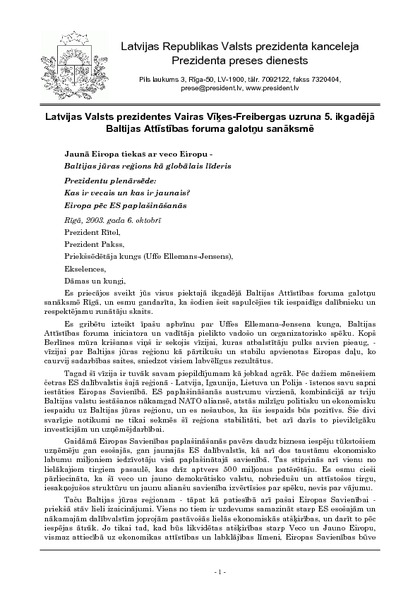 Latvijas Valsts prezidentes Vairas Vīķes-Freibergas uzruna 5. ikgadējā Baltijas Attīstības foruma galotņu sanāksmē