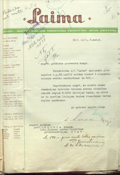 Vēstule Jāzepam Vītolam no A/S "Laima"
