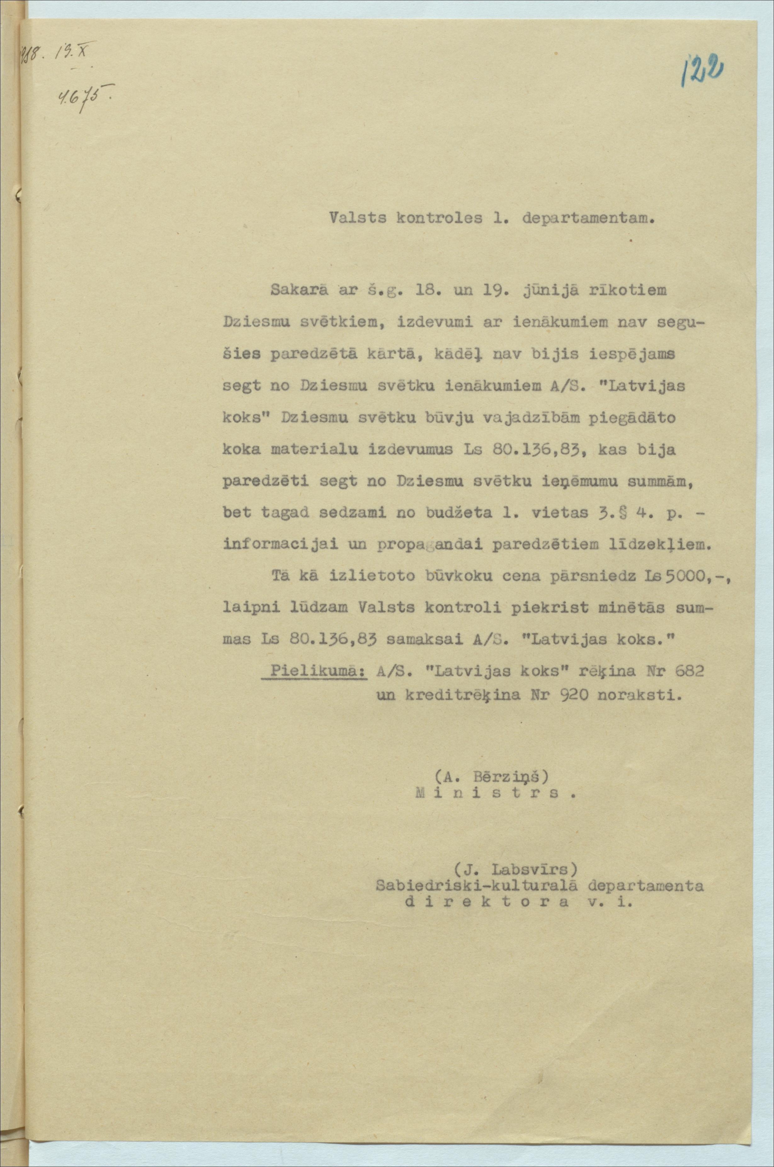 Sarakste ar Valsts kontroli par ceļojošo skaņu filmas izrādes maršrutu un Dziesmu svētku sarīkošanu - 1934-1938 (Dokuments)