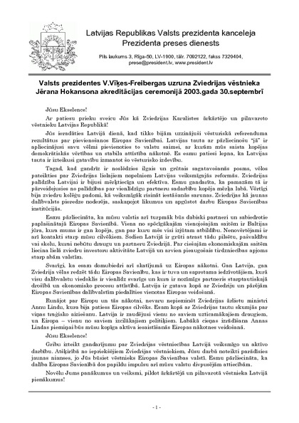 Valsts prezidentes V.Vīķes-Freibergas uzruna Zviedrijas vēstnieka Jērana Hokansona akreditācijas ceremonijā 2003.gada 30.septembrī