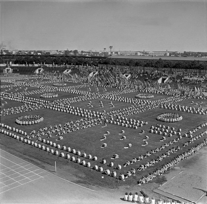 Padomju Latvijas 25. gadadienai veltītie sporta svētki "Daugavas" stadionā. Rīga, 1965. gada 18.jūlijs. Panorāmas foto - vingrotāji veido ģeometriskus rakstus. Foto: Juris Poišs. Šajā dienā Mežaparkā notiek arī Padomju Latvijas (XIV Vispārējo latviešu) dziesmu svētku noslēguma koncerts.