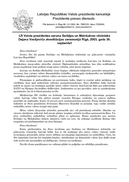 LR Valsts prezidentes uzruna Serbijas un Melnkalnes vēstnieka Dejana Vasiljeviča akreditācijas ceremonijā Rīgā, 2003. gada 30. septembrī