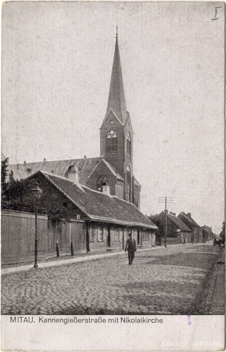 Kannengieβenstraβe jeb latviskajā variantā Kalnlējēju iela mūsdienās ir pārdēvēta par Mātera ielu par godu Jurim Māteram, kurš miris Jelgavā. Nikolaja baznīcas jeb Svētās Vienības baznīcas pamatakmens likts 1904.gadā, to pabeidza celt 1907.gadā pēc arhitekta Konstantīna Pēkšēna meta. Šis bija pirmais dievnams ar pastāvīgu latviešu pārvaldi, taču, lai iegūtu no krievu iestādēm atļauju šīs latviešu baznīcas celšanai, to bija spiesti nodēvēt par Nikolaja baznīcu par godu Krievijas caram. 1937.gadā to pārdēvēja par Sv. Vienības baznīcu, tā bija lielākā luterāņu baznīca Zemgalē ar vairāk nekā 1500 sēdvietām. II Pasules karā baznīca bija salīdzinoši maz cietusi, bet pēc padomju un partijas iestāžu rīkojumiem Dievnams tika pilnībā nojaukts 1954.gadā.