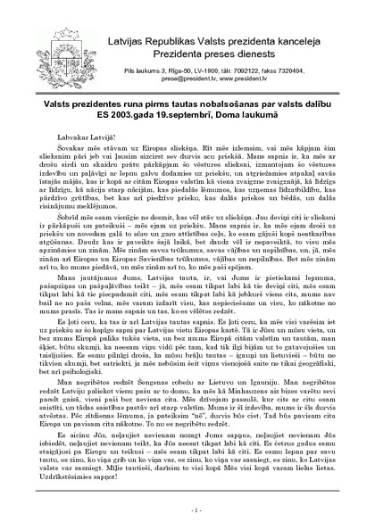 Valsts prezidentes runa pirms tautas nobalsošanas par valsts dalību ES 2003.gada 19.septembrī, Doma laukumā